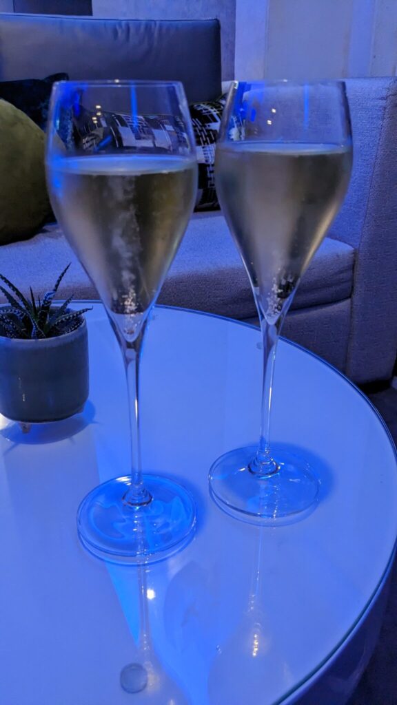 So when we arrive and our reservation is not going to start exactly on time, the maître d’ invites us to go to the bar and have a glass of champagne. He recommends one in particular and I’m thinking, ok, you are the expert. I’m also thinking, pretty sweet that we get an extra glass of wine because they are running late.