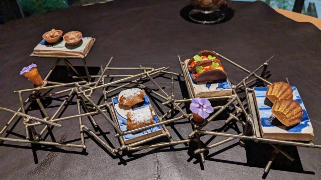 So the meal starts with this “tour” of Portugal with seven insane presentations of little tapas from various regions in Portugal and one from Spain. One was a shrimp that looks like a fossil and has to be excavated from sand made of some kind of spices (that one was the only one I thought was gross, and sadly was the very first one, so cue panic haha). Everything else ended up being very delicious and unique, and when it finished we were brought into the tiny dining room for our actual meal. It was amazing, but the theme seemed to be: why does this thing taste completely different than I would have guessed, and why is it more delicious?