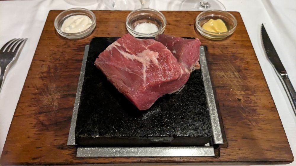 Funny story — Matt and Christine remembered loving this place and loving the steak on the stone, but did not remember all the details. Trusting them, I went ahead and just ordered that anyway. When they did not ask me for a temperature for my steak, I joked that it better not come out raw. So, it was pretty hilarious when this was served to me: